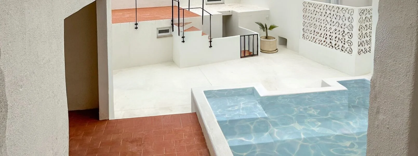 No exterior, a casa ganha outra dimensão: escadas de tijoleira, pequenos recantos, um tanque/piscina onde a água reflete o céu, um barbecue para refeições ao ar livre e canteiros com plantas mediterrânicas que dão cor ao casario branco. É o tipo de lugar onde apetece tomar o primeiro café do dia ao ar livre e deixar o tempo passar devagar.